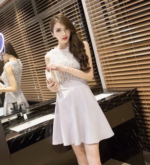 韓国 パーティーやお呼ばれに ボタニカル柄とレースが可愛いフレアワンピース ノースリーブのセクシーなパーティードレス
