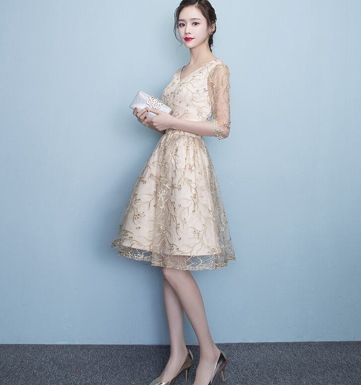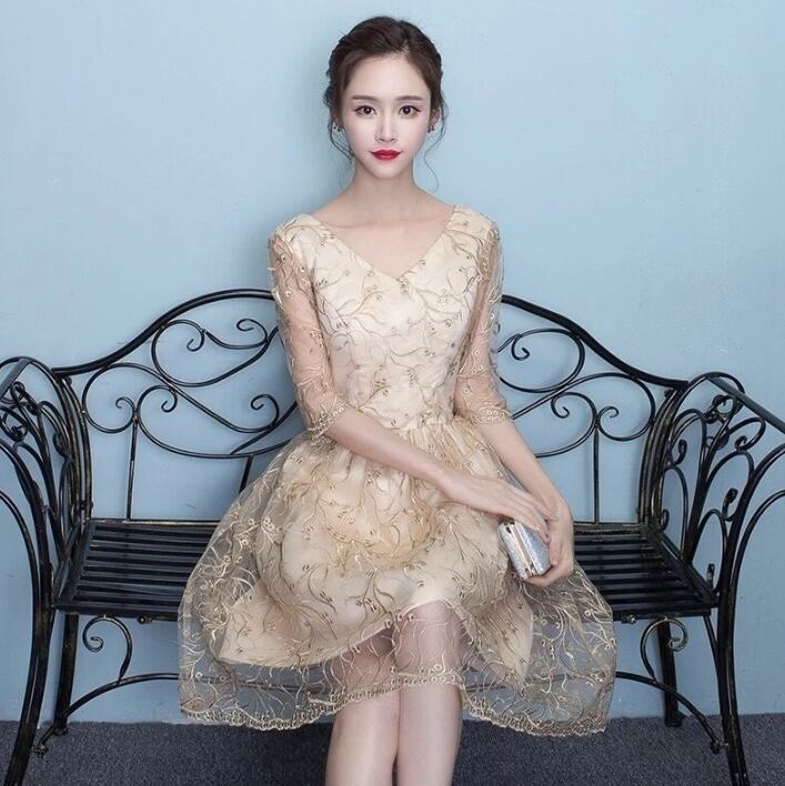 七分袖チュール花柄 Vネック ドレス ワンピース 二次会 結婚式