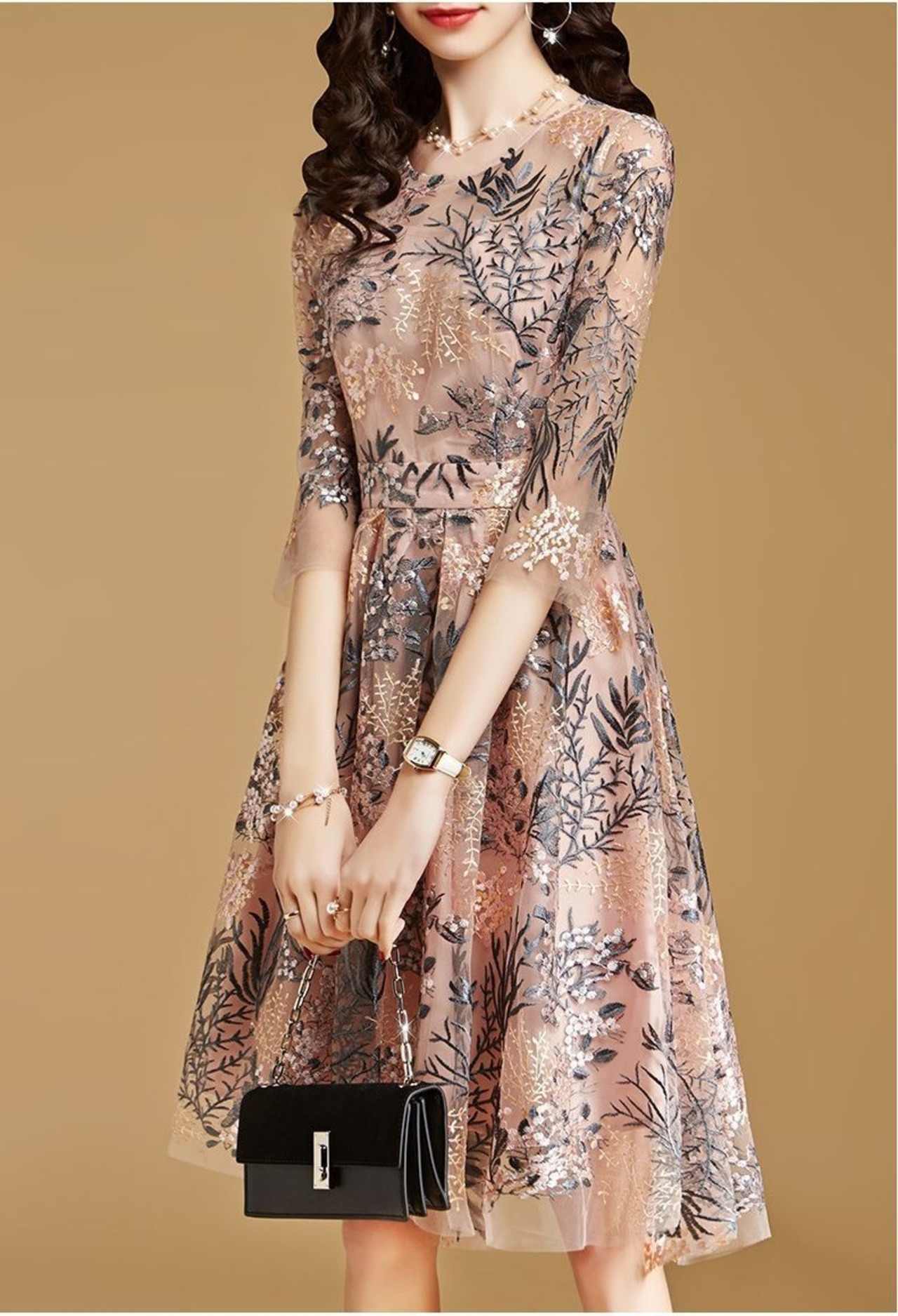 【CUTE!】パールピンク★パーティー・結婚式☆刺繍半袖ドレス
