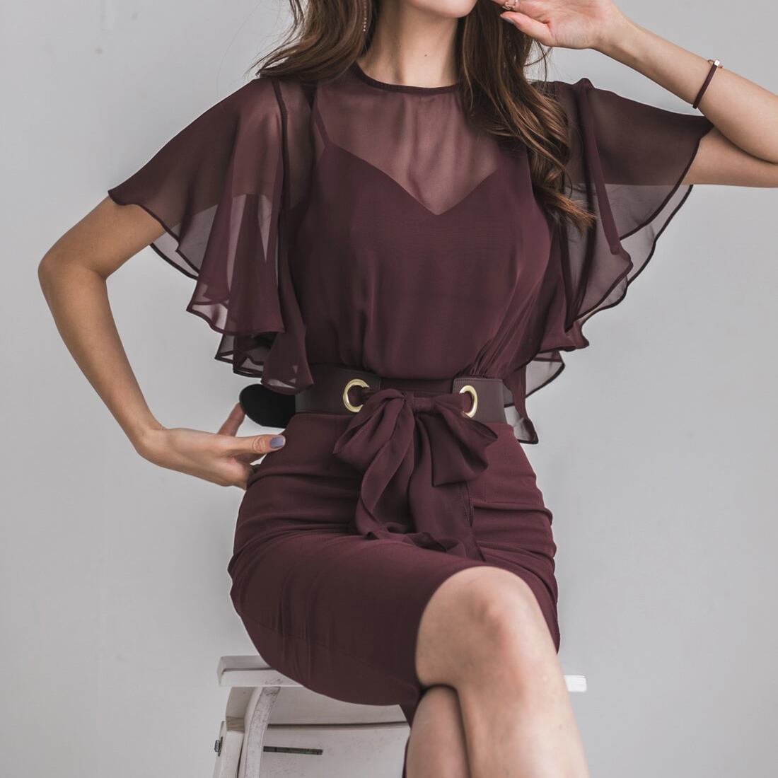 ベルト付き 重ね着風 ドレス