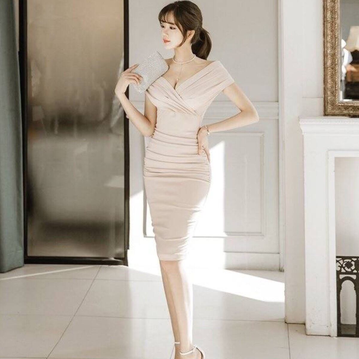 オフショルダー デコルテ魅せ ボディコン ミディアムドレス