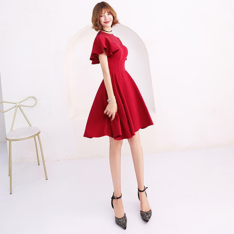 半袖 花柄レース×無地 フリル袖 パーティー ミディアムドレス