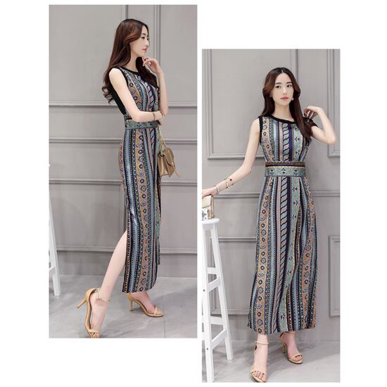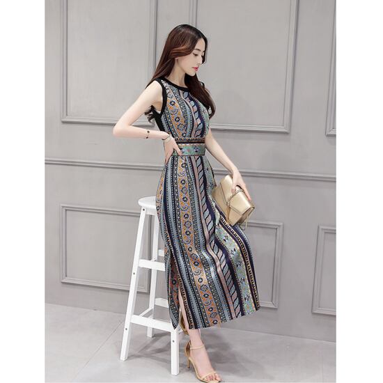 きれいめ エスニック プリント ライン マキシ丈 ワンピース