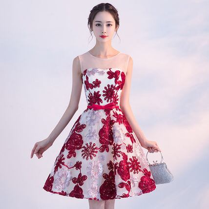 赤花柄 パーティードレス 結婚式 二次会 発表会 演奏会 衣装