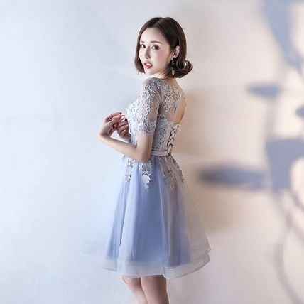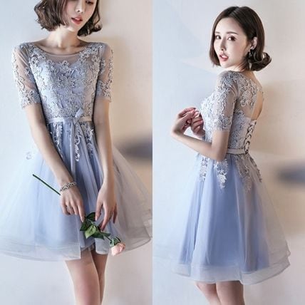 可憐な花柄パーティードレス シルバー 膝丈 結婚式 二次会