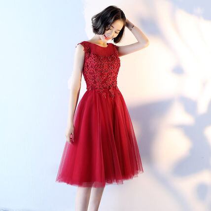 赤チュール膝丈パーティードレス 結婚式 二次会 演奏会 発表会