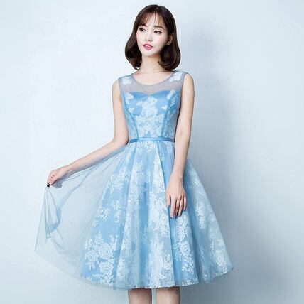 水色レース 透けパーティードレス 膝丈 結婚式 発表会 演奏会