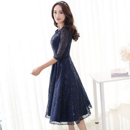 ネイビー 膝丈レース パーティードレス 紺 結婚式 五分袖 発表会