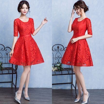 赤 総レースパーティードレス 膝丈 ミニ 五分袖 結婚式 演奏会