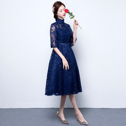 ネイビー七分袖 膝丈パーティードレス 結婚式 二次会 フォーマル