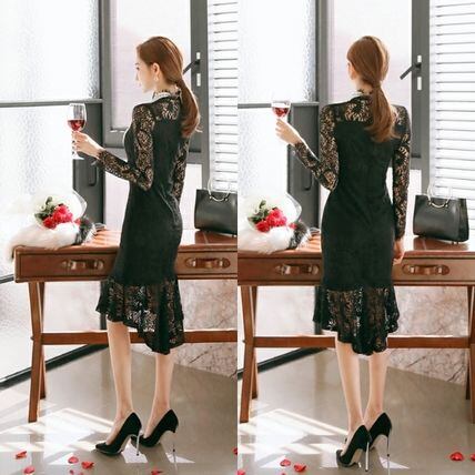 黒レースマーメードパーティードレス 膝丈 結婚式 二次会 キャバ