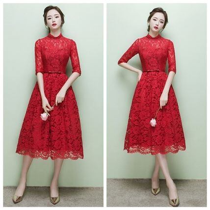 赤総レースパーティードレス ミドル丈 ミモレ 結婚式演奏会式典