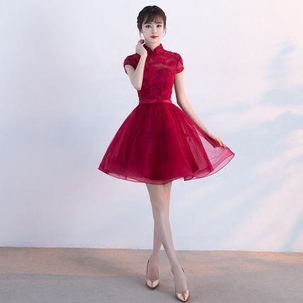 チュールたっぷりふんわりパーティードレス 赤 半袖 ミニ 結婚式