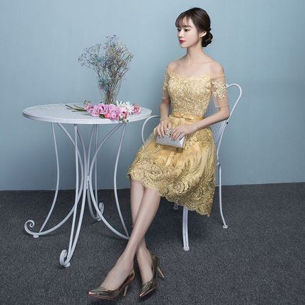 ゴールドオフショルダーパーティードレス 膝丈 結婚式 二次会