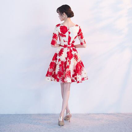 半袖 赤総柄パーティードレス 膝丈 ミニ 結婚式 二次会 発表会