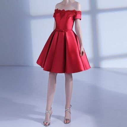 オフショルダー 赤 サテンパーティードレス 結婚式 二次会 衣装