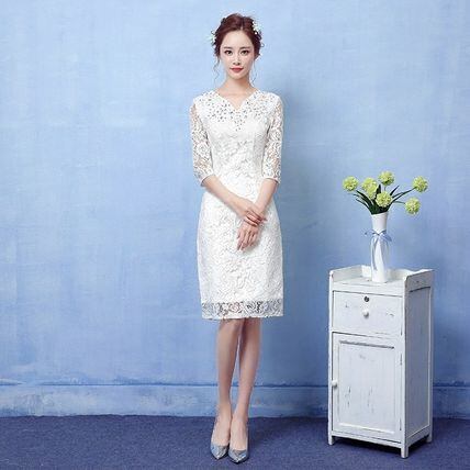 白レースのパーティードレス タイト 膝丈 結婚式 演奏会式典
