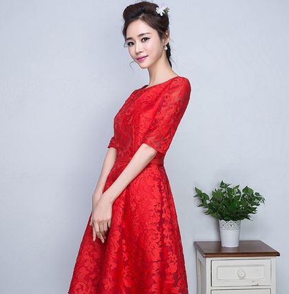 鮮やかな赤のフレアパーティードレス 結婚式二次会お呼ばれに