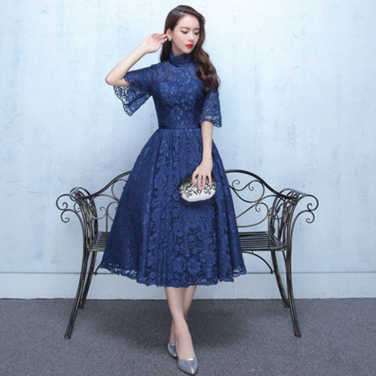 袖フレア 総レースパーティードレス ミドル丈 ブルー 紺