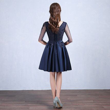 袖透けレースネイビーパーティードレス 膝丈 結婚式 発表会 衣装
