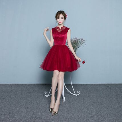深紅 チュール切り替え パーティードレス ノースリーブ 結婚式