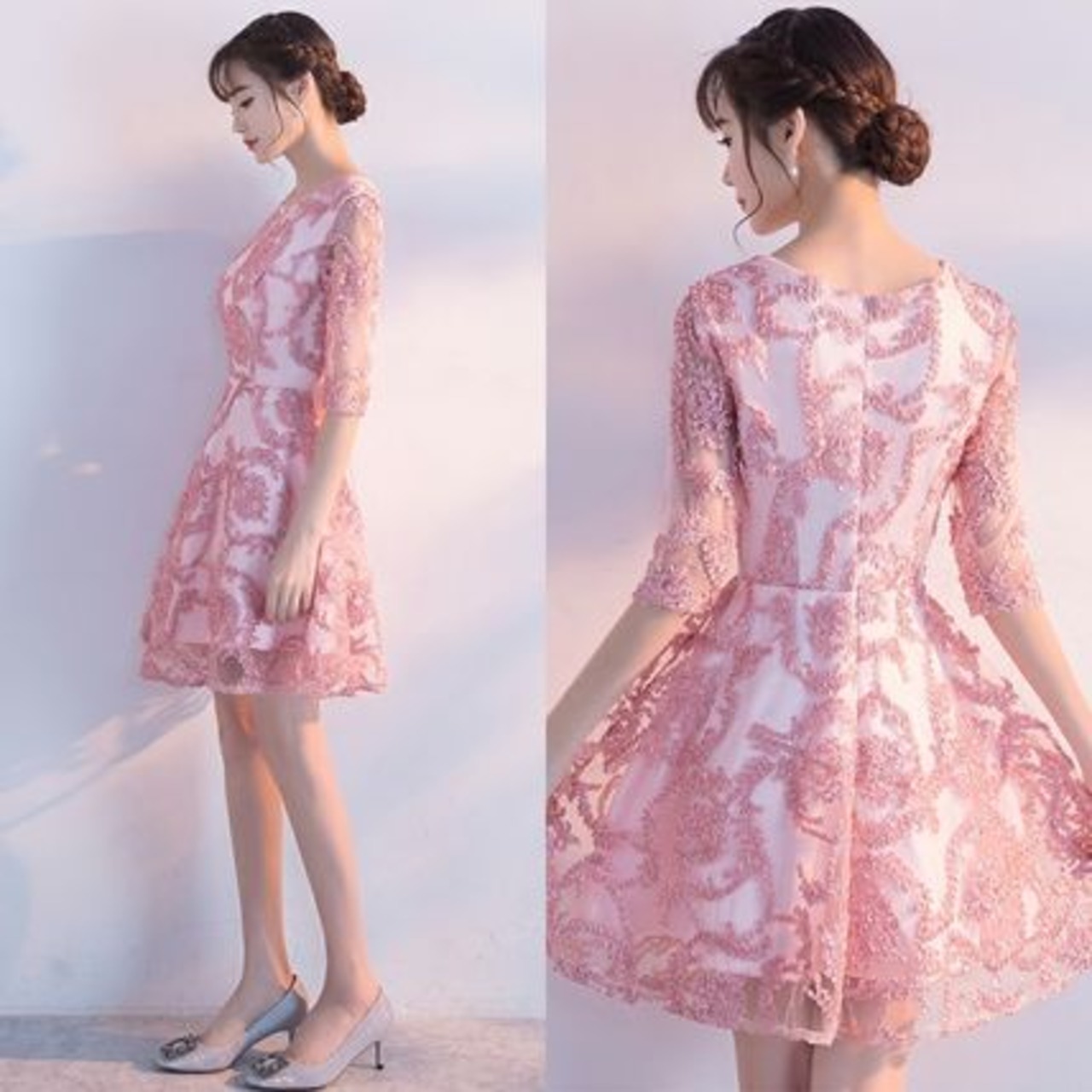 ピンク レースパーティードレス 結婚式 二次会 発表会 ママ 衣装