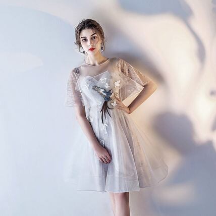 シースルー膝丈パーティードレス 半袖 結婚式 二次会 発表会 春