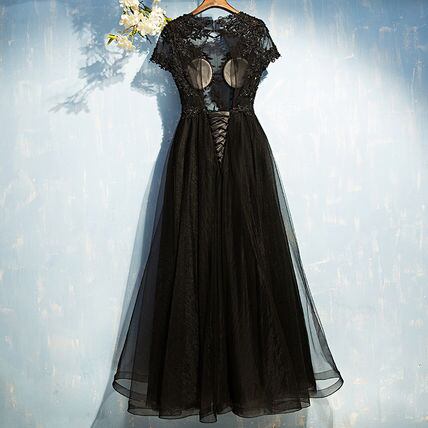 カップ付き 半袖 透けレースのパーティードレス黒 マキシ ロング