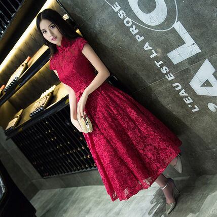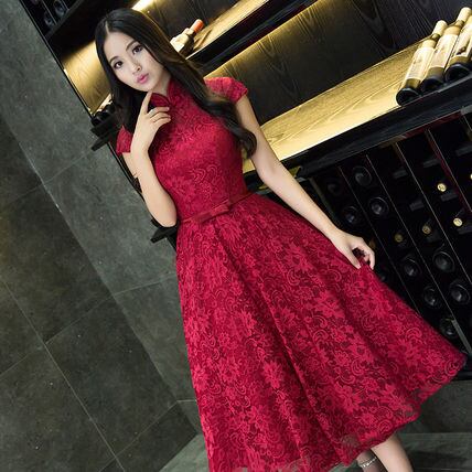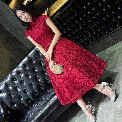 半袖フレアパーティードレス ワンピース 赤 レース 発表会演奏会