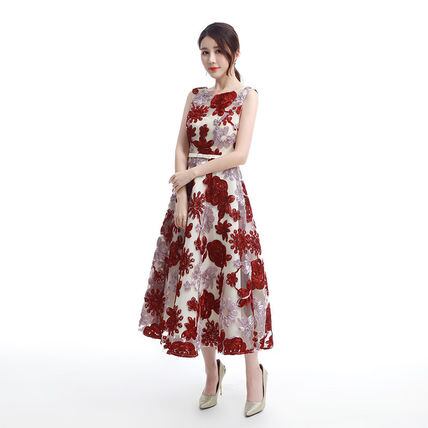 赤 花柄 ミドルロング パーティードレス 結婚式 二次会 発表会