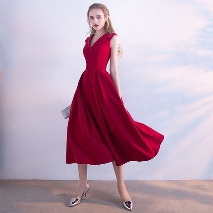 Vネック赤ロングパーティードレス 結婚式 二次会 発表会 演奏会