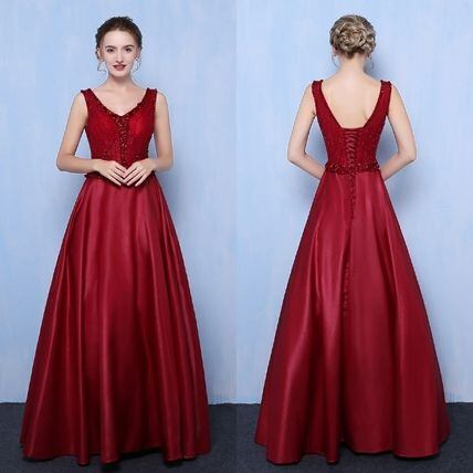 光沢感ノースリーブロングパーティードレス 赤 マキシ丈 演奏会