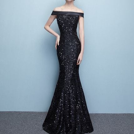 オフショルダー黒ロングパーティードレス 結婚式 キャバ 衣装