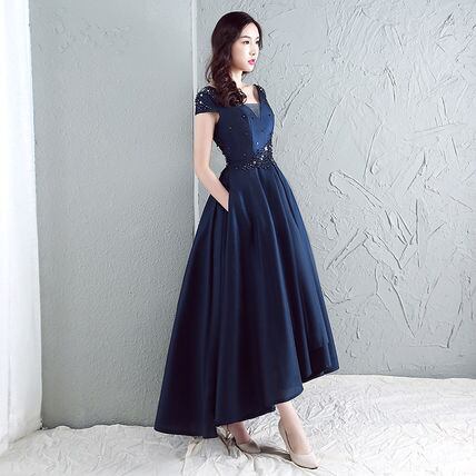 ネイビーロングパーティードレス 半袖 結婚式 二次会 フォーマル