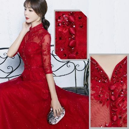 スタンドカラーパーティードレス 五分袖 透け感 結婚式 式典