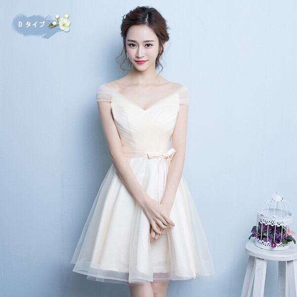 ドレス ミニドレス パーティードレス お姫 ウェディング ベアトップ オフショルダー 無地 編み上げ 結婚式 ワンピ 披露宴 着痩せ シャンパン色 s1224